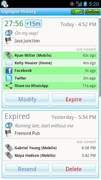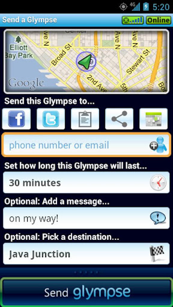 Glympseは自分の位置情報を相手に知らせたいときにメールで説明したり、電話をかける必要がなく、地図と一緒に送ることができる便利なアプリです。